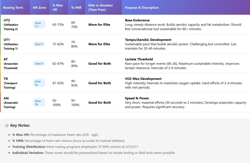 So yes, rowers may have been a little cheeky, inventing their own terminology to sound more sophisticated. But there’s a method to the madness: understanding UT1 and UT2 alongside HR zones can help both new and experienced rowers translate boat feel into measurable intensity, whether on the water or the erg.